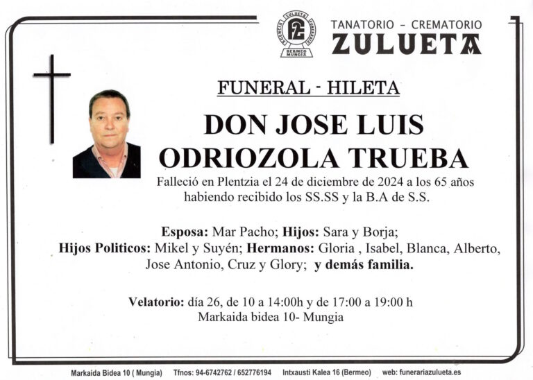 DON JOSE LUIS ODRIOZOLA TRUEBA mayo 9, 2025 ESQUELAS-FUNERARIAS, FUNERARIA ZULUETA BERMEO DON JOSE LUIS ODRIOZOLA TRUEBAFalleció en: Plentzia Bizkaia/VizcayaFallecido: 24/diciembre/2024A los 65 años de edad.Se ruega una oración por su alma Si nada nos salva de la muerte, al menos que el amor nos salve de la vida. Deja una respuesta Cancelar la respuestaTu dirección de correo electrónico no será publicada. Los campos obligatorios están marcados con *Comentario * Nombre * Correo electrónico * Web Guarda mi nombre, correo electrónico y web en este navegador para la próxima vez que comente. Anterior Siguiente Deja una respuesta Cancelar la respuestaTu dirección de correo electrónico no será publicada. Los campos obligatorios están marcados con *Comentario * Nombre * Correo electrónico * Web Guarda mi nombre, correo electrónico y web en este navegador para la próxima vez que comente.